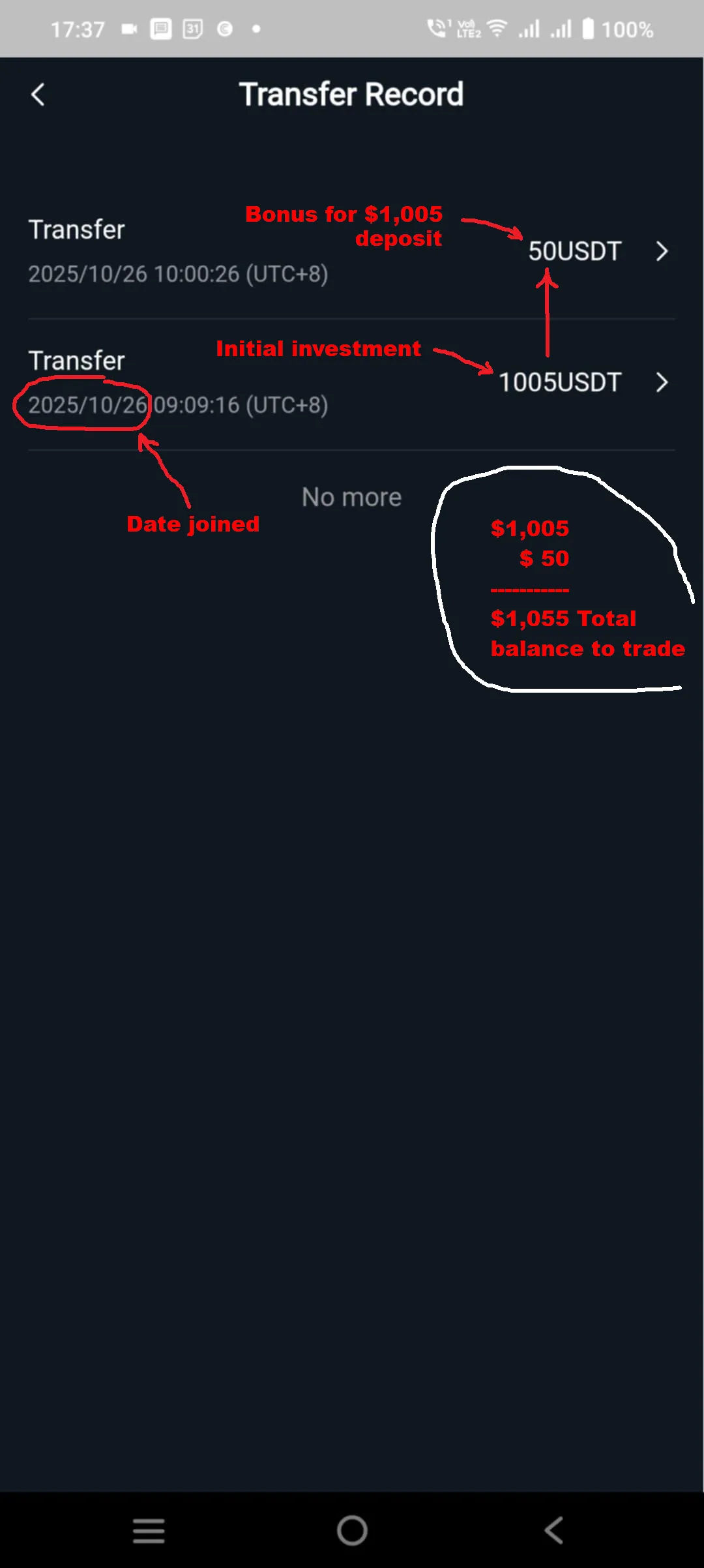Started with $1,005 deposit and received a $50 Bonus, then Traded October 27, 2025