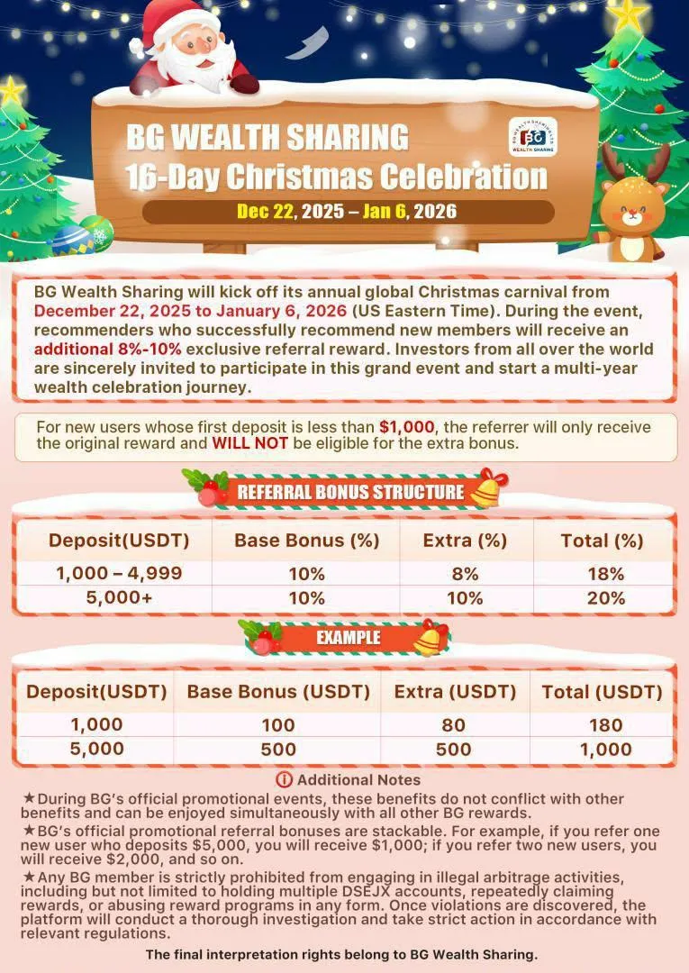 The core highlight of this official event is the additional 8%-10% referral bonus for all referrers. In other words, as long as a new member is successfully referred and makes a deposit within the event scope, the referrer can receive a total referral bonus of 18%-20%. Moreover, new members joining BG Wealth Sharing will also enjoy the same benefits, truly achieving "everyone benefits and grows together." This is not just a reward, but an attitude, ensuring that everyone who trusts BG receives the most tangible returns.